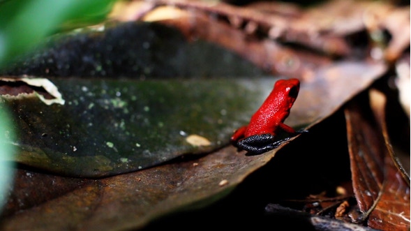 I kneeled on the rainforest floor and lowered the camera, filming with a 50mm prime lens. It was very hard to frame a shot. Since the frog was so small (less than 1/2 an inch long) I had to get the camera in close and there was very little depth-of-field, making pulling focus very difficult. The frog jumped around uncontrollably.